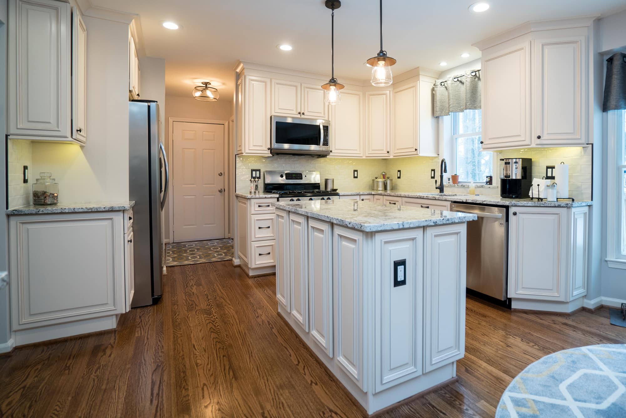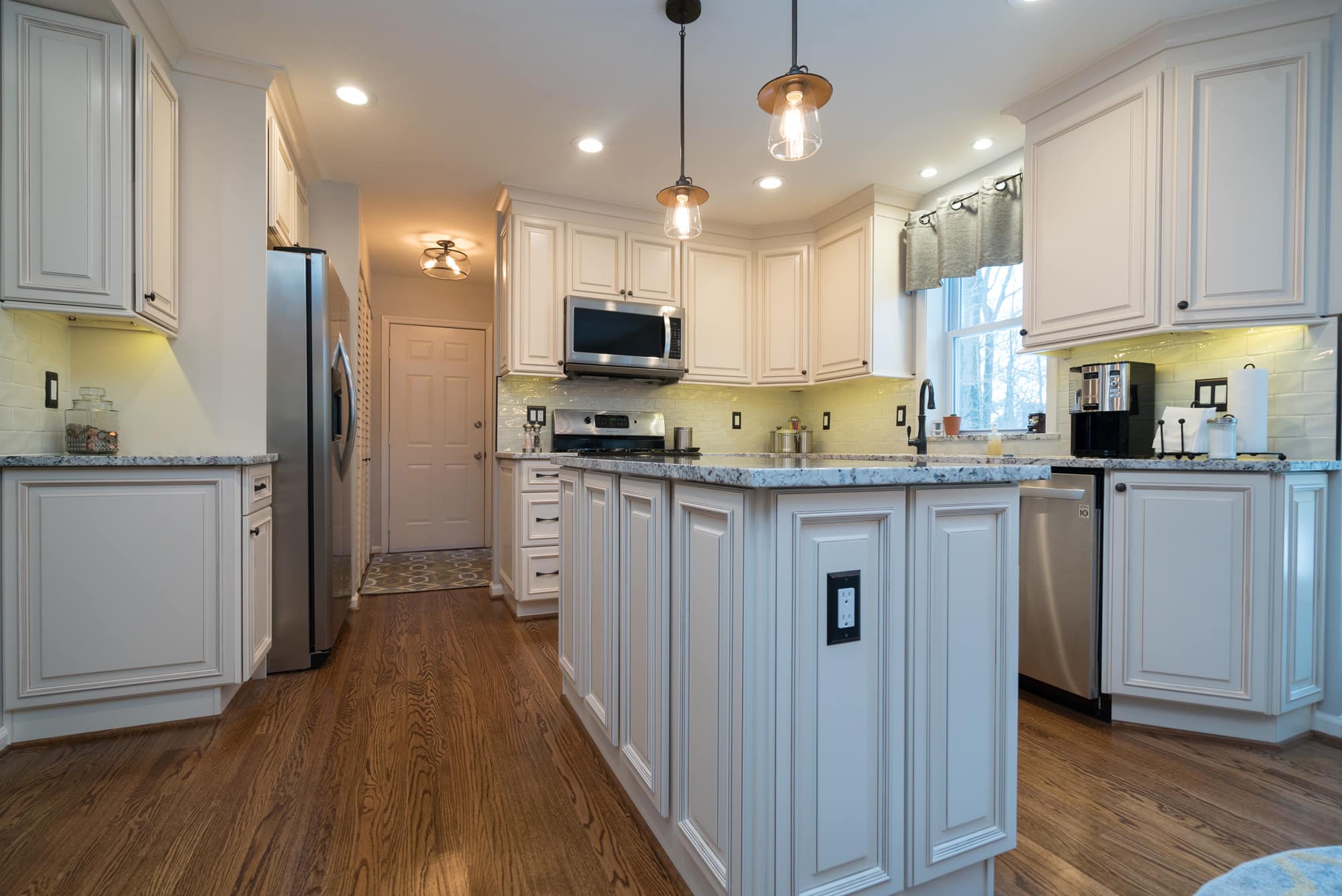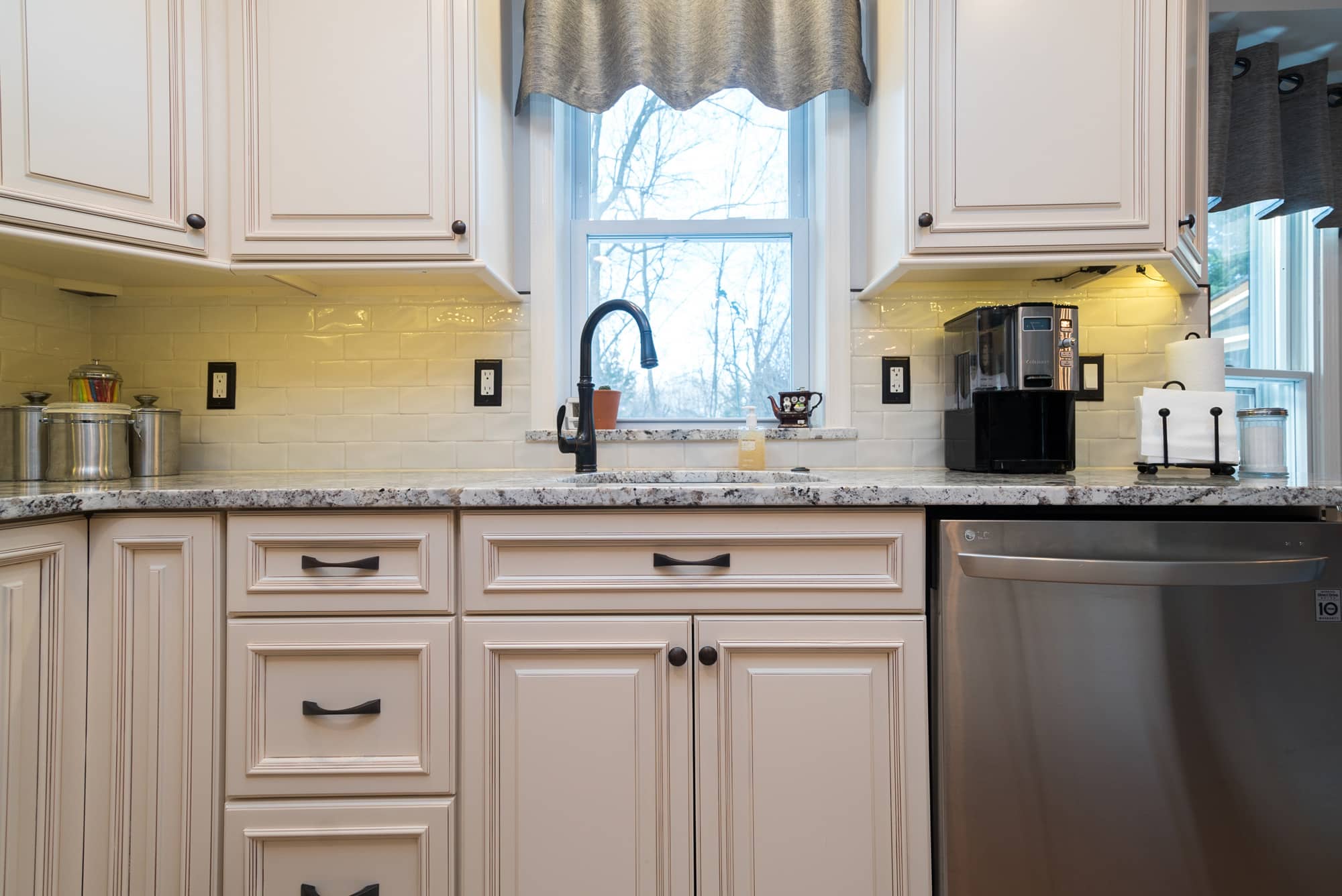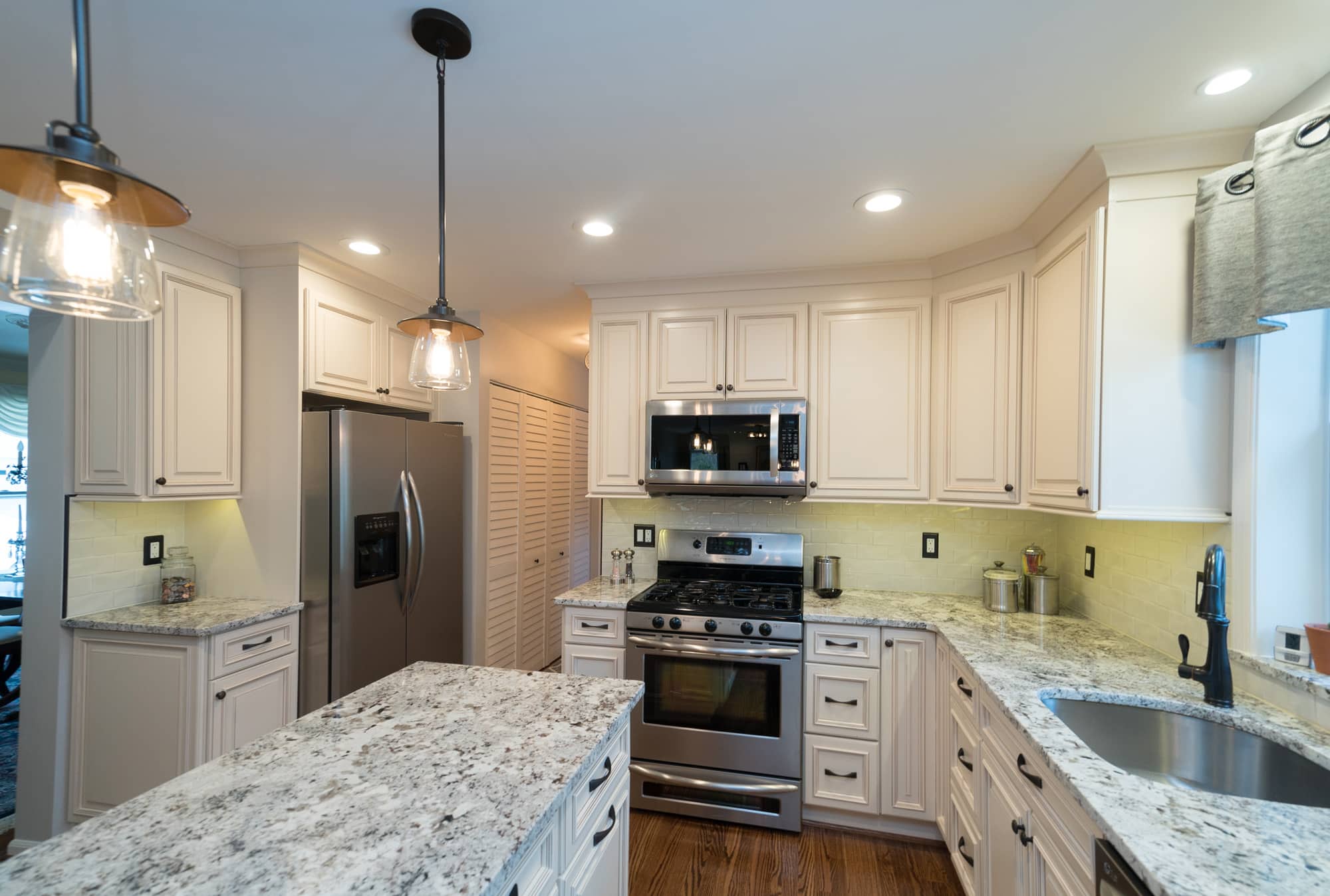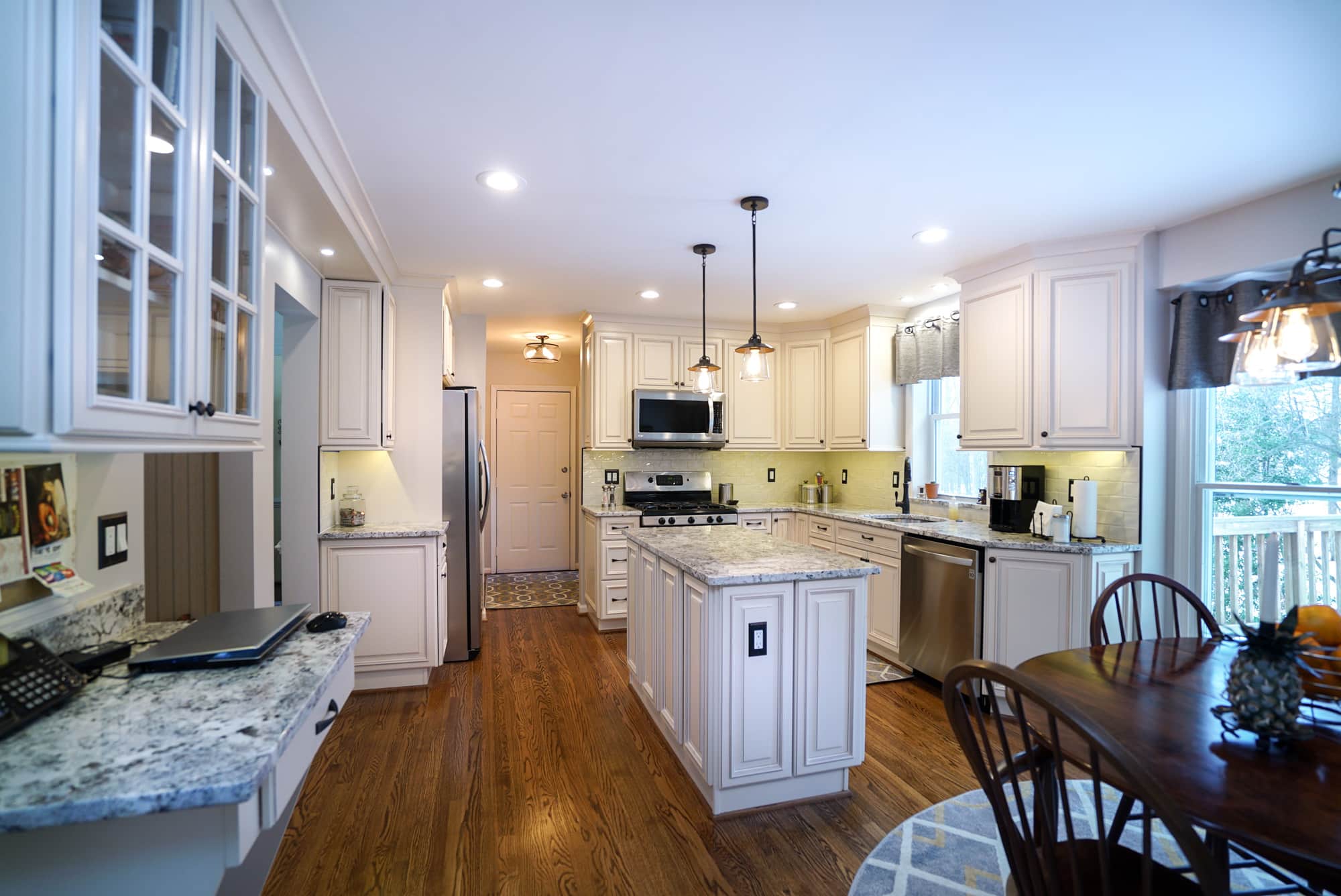 The Mahoney family came to the USA Cabinet Store Chantilly Showroom, looking to remodel their old kitchen. Their Designer Sarah worked with them to create many design possibilities to ensure this kitchen remodel would give them everything they desired and create an inviting space in their home to enjoy for years to come. They decided on a bright and traditional design for the kitchen by using Ivory Glaze Fabuwood Cabinets. The frames on these cabinets give the room a traditional feel while the ivory color makes the room appear brighter, making it a wonderful room to entertain in. Modern touches were added with the porcelain subway tile backsplash and sleek edges on the Brown Fantasy Granite countertops. The natural light compliments the kitchen’s open floor plan and light colors. This bright, newly remodeled kitchen provides a wonderful center for family life. Come by the USA Cabinet Store to see how we can help you rejuvenate your home!